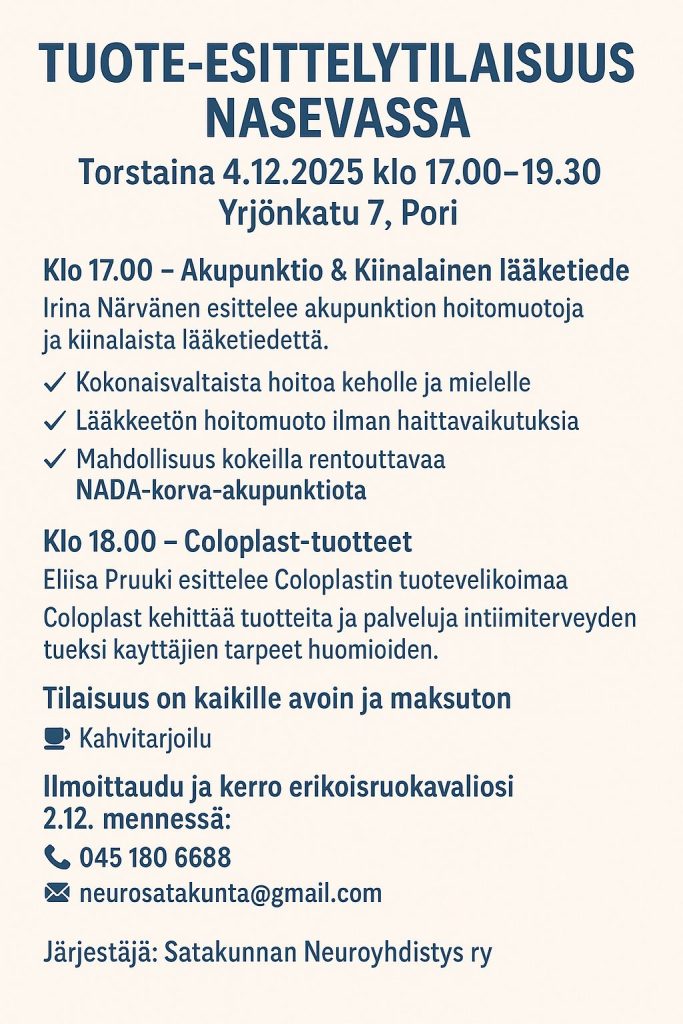 Esittelytilaisuus Akupunktio & Kiinalainen lääketiede & Coloplastin tuotteet NASEVASSA to 4.12.2025 klo 17.00–19.30