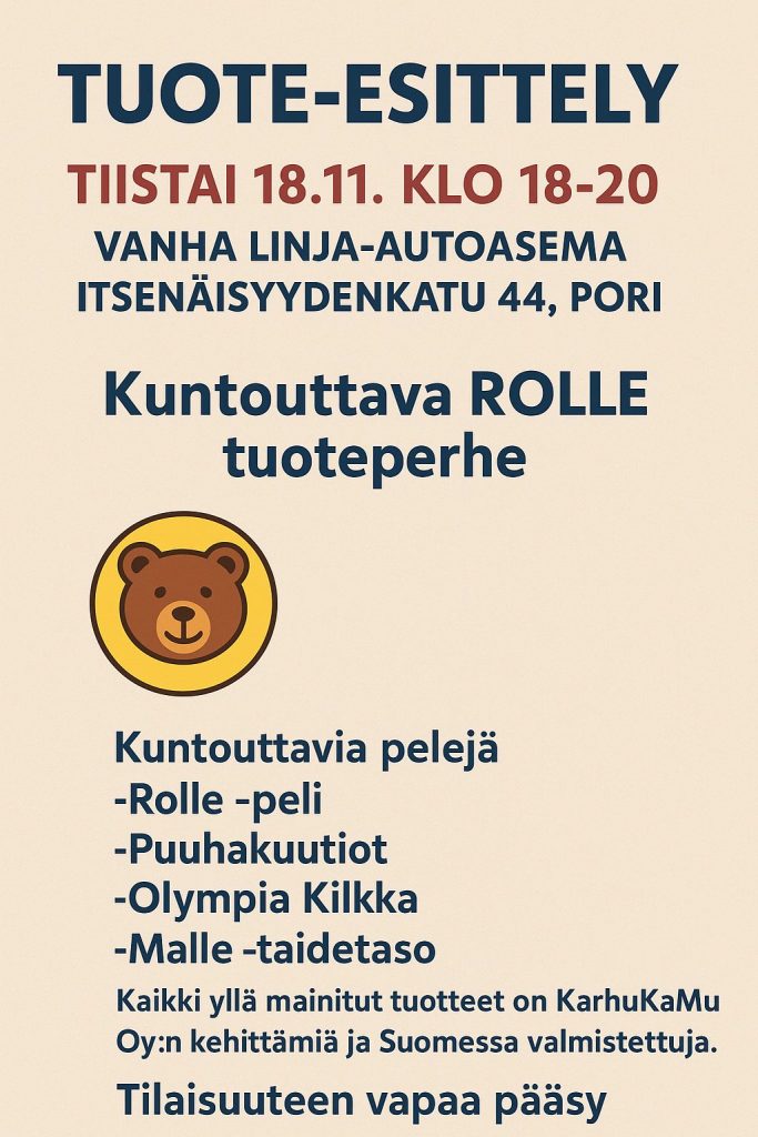 Kuntouttava Rolle tuoteperheen esittely 18.11.25 klo 18 Porissa 12.11.2025 Kategoriat: Yleinen Tule tutustumaan kuntouttavaan Rolle-tuoteperheeseen vanhalle linja-autoasemalle Poriin! Vapaa pääsy! Kuntouttava ROLLE tuoteperhe Järjestäjänä Satakunnan Neuroyhdistys ry Share on Facebook Share Share on TwitterTweet