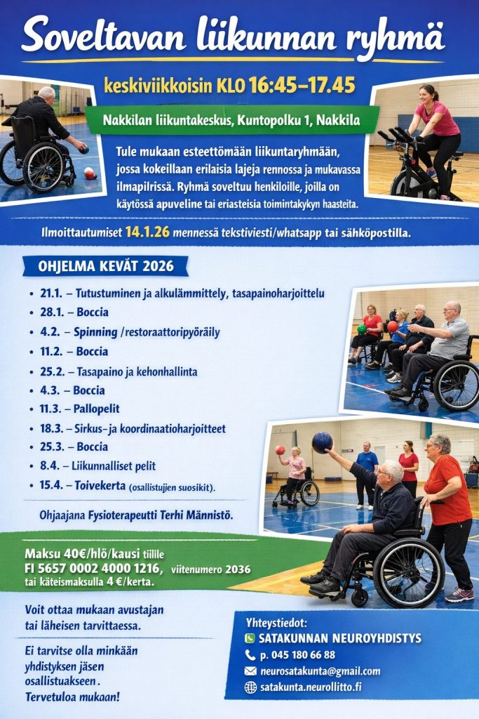 Nakkilan soveltava liikuntaryhmä alkaa 21.1.2026 8.1.2026 Kategoriat: Yleinen Lähde mukaan soveltavan liikunnan ryhmään Nakkilaan, ei tarvitse olla minkään yhdistyksen jäsen osallistuakseen