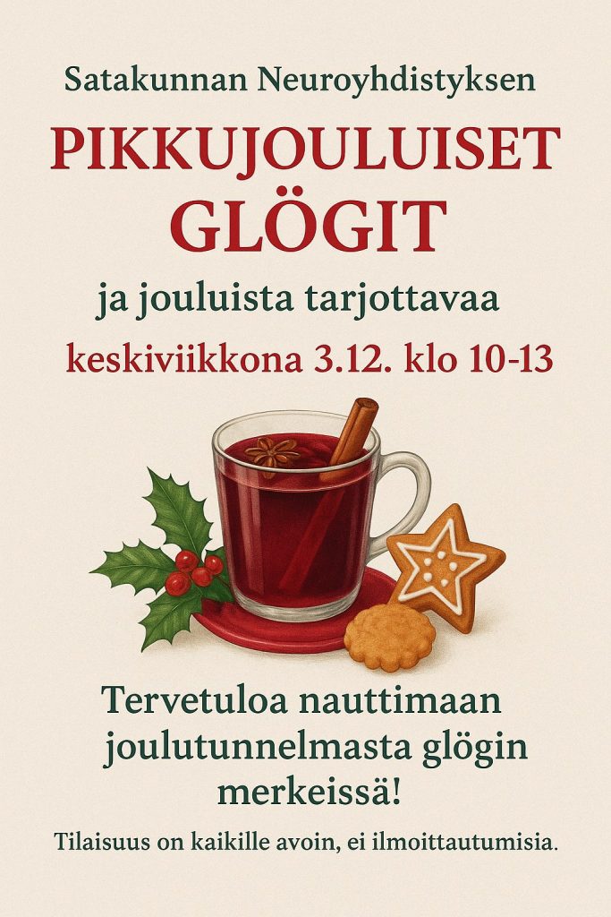 PIKKUJOULUN GLÖGIT ja jouluista tarjottavaa keskiviikkona 3.12. klo 10-13 26.11.2025 Kategoriat: Yleinen Tervetuloa nauttimaan joulutunnelmasta glögin merkeissä! Tilaisuus on kaikille avoin, ei ilmoittautumisia.